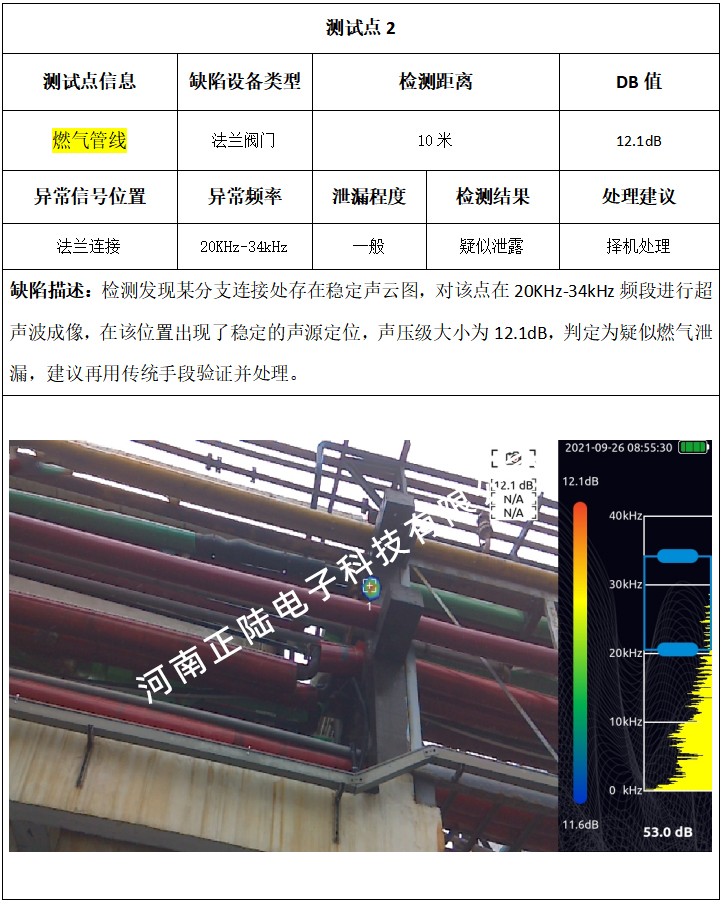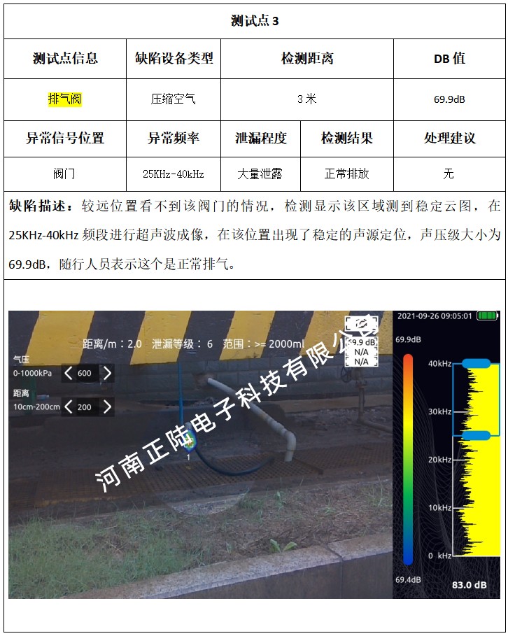 2021年9月26日,公司技術員使用氣體漏點可視定位儀,在某化工廠現場對空壓機廠房進行檢測,查到2處較大異常泄漏點,壓縮空氣管線1處正常排放泄漏點,隨即通知工廠維修工程師進行處理,避免了工廠因泄漏造成的經濟損失及危險因素的存在。
