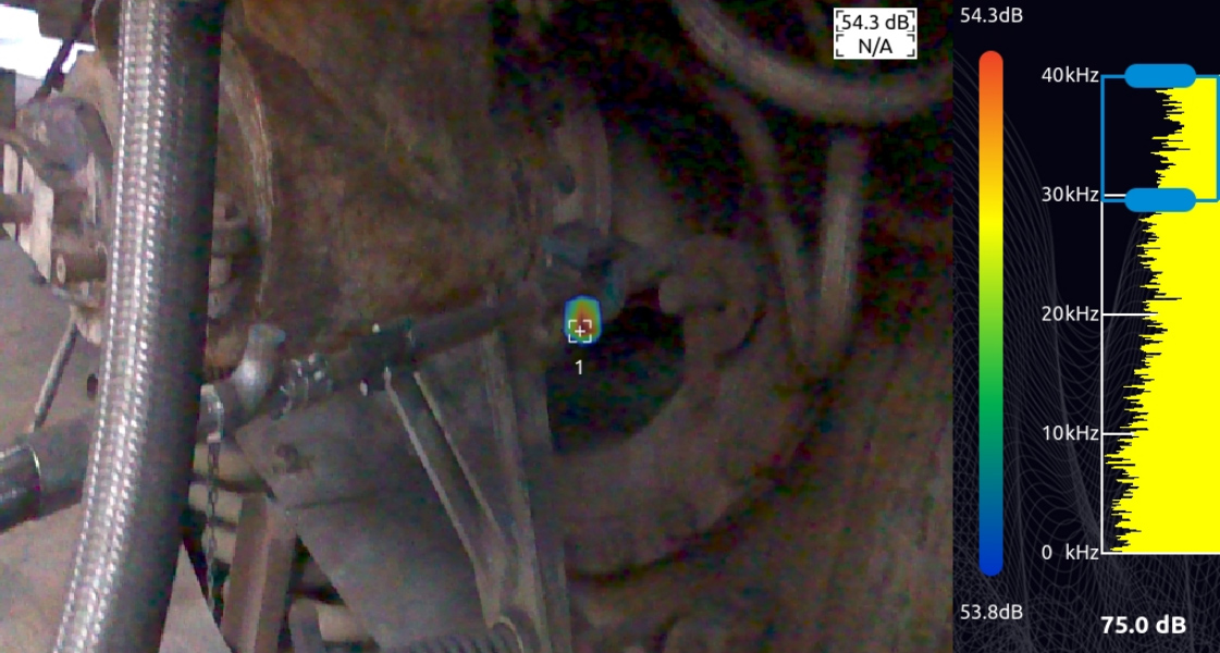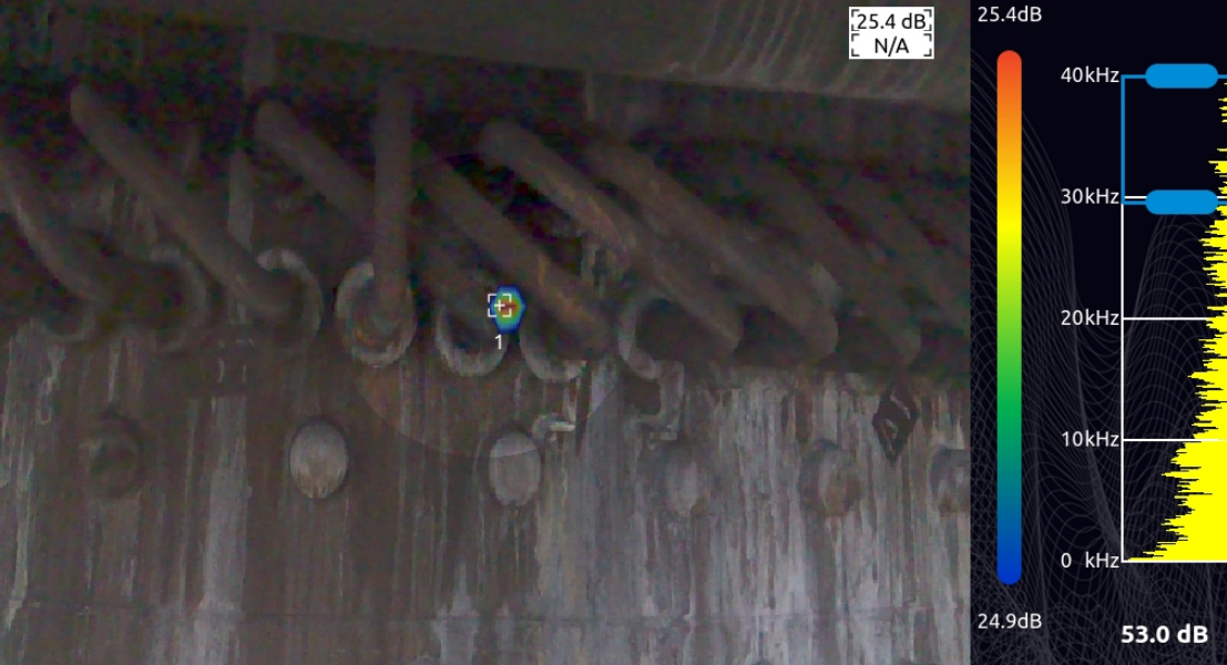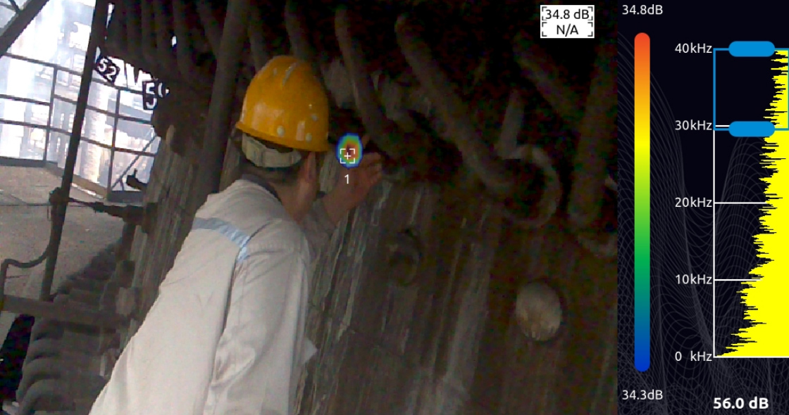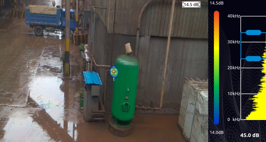 二、4 號高爐腰部煤氣管泄漏:檢測發現 4 號高爐腰部某煤氣管位置存在煤氣泄漏情況,對泄漏點在 30KHz-40kHz 頻段進行超聲波成像,在該位置出現了穩定的聲源定位,聲壓級大小為 34.8dB,判定為煤氣泄漏,建議維修處理。
