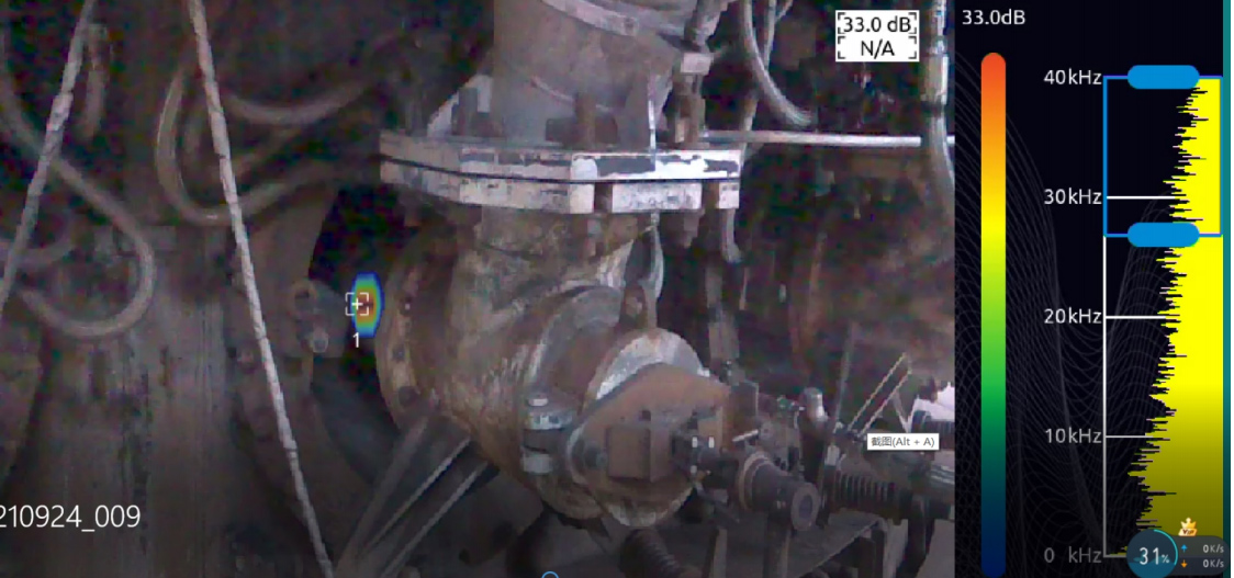 三、煉鐵分廠4 號高爐煤氣管線泄漏:經過不同角度多次檢測,均在4號高爐3層平臺爐腰煤氣管線某點測到穩定云圖,對泄漏點在30KHz-40kHz頻段進行超聲波成像,在該位置出現了穩定的聲源定位,聲壓級大小為 25.4dB,判定為煤氣泄漏,建議擇機維修處理。