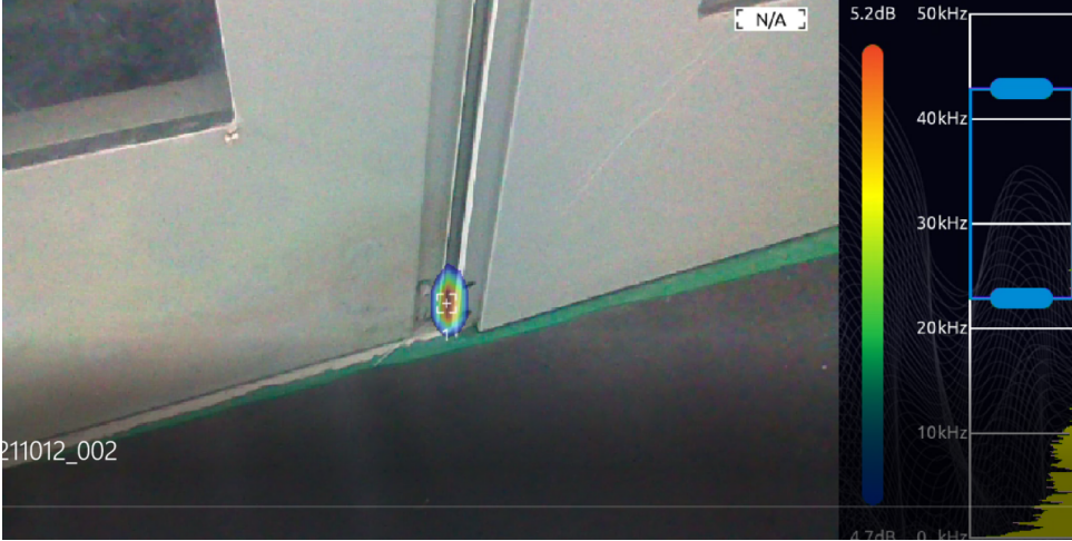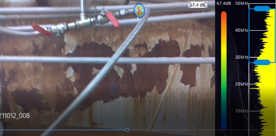 缺陷二:在脫銷反應裝置外表管線手閥處檢測到穩定聲學云圖,頻段28KHz-48kHz成像顯示,圖示位置有穩定聲學云圖,聲壓值67.4dB,手掌置于跟前有明顯氣流沖擊感覺,屬于壓縮空氣泄漏,建議擇機處理。