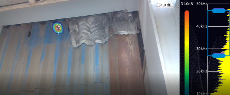 缺陷一:除塵器風箱外壁保溫連接處出線穩定聲學云圖,用頻段28KHz-48kHz進行成像檢測,在圖示位置出線穩定云圖,聲壓31.0dB,建議驗證處理。